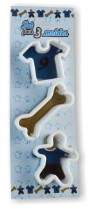 Set compuesto por 3 moldes de diferentes divertidos diseños para niña o varón. Muy buen corte. Fácil de limpiar. Ideal para realizar galletitas junto a los chicos de la familia y dejar volar la imaginación a la hora de decorarlas.
