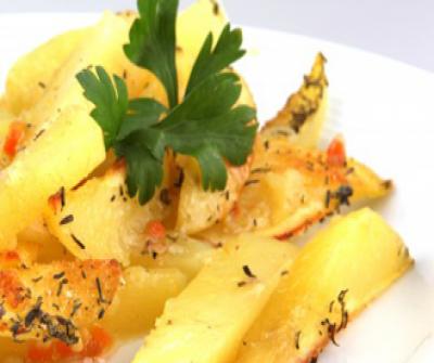 4. Coloque as batatas na Torteira "Covey" para microondas em várias camadas, intercalando uma camada de batatas e uma capa de creme.